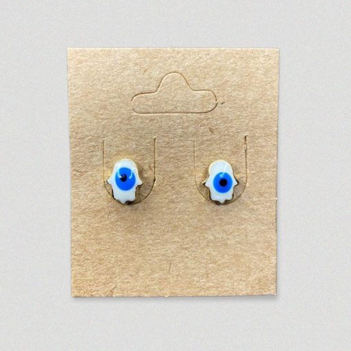 Par de brinco em formato mão de Fátima esmaltado em zircônia na cor branca com detalhe de olho grego no centro.